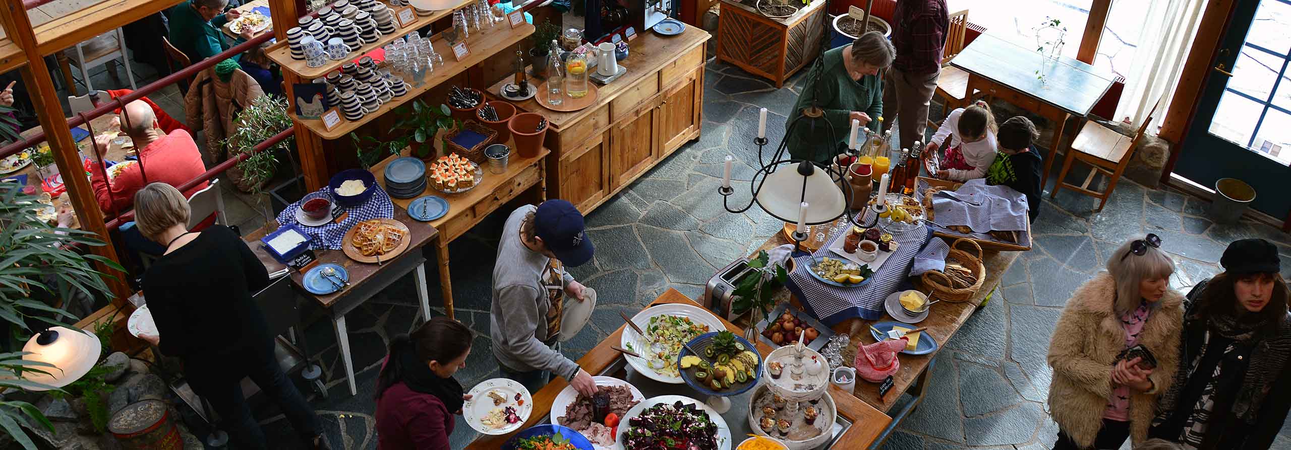 Som under alla år gör vi de vackraste och godaste matiga smörgåsarna, serverat med mycket grönt "pynt" och har alltid ett utbud av "gofika" med kakor bakat i huset av de bästa tänkbara råvarorna. För våra yngre gäster steker vi pannkakor och toppar med grädde och vår bästa jordgubbs-rabarbersylt.